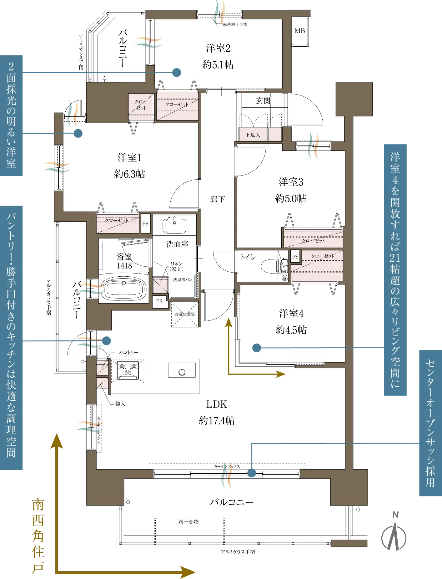 通風・採光に優れ、プライバシー性の高い角住戸を