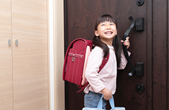 ⽞関ドアに設置した開閉センサーで、外出先からのお⼦様の帰宅・外出をスマホにお知らせします。